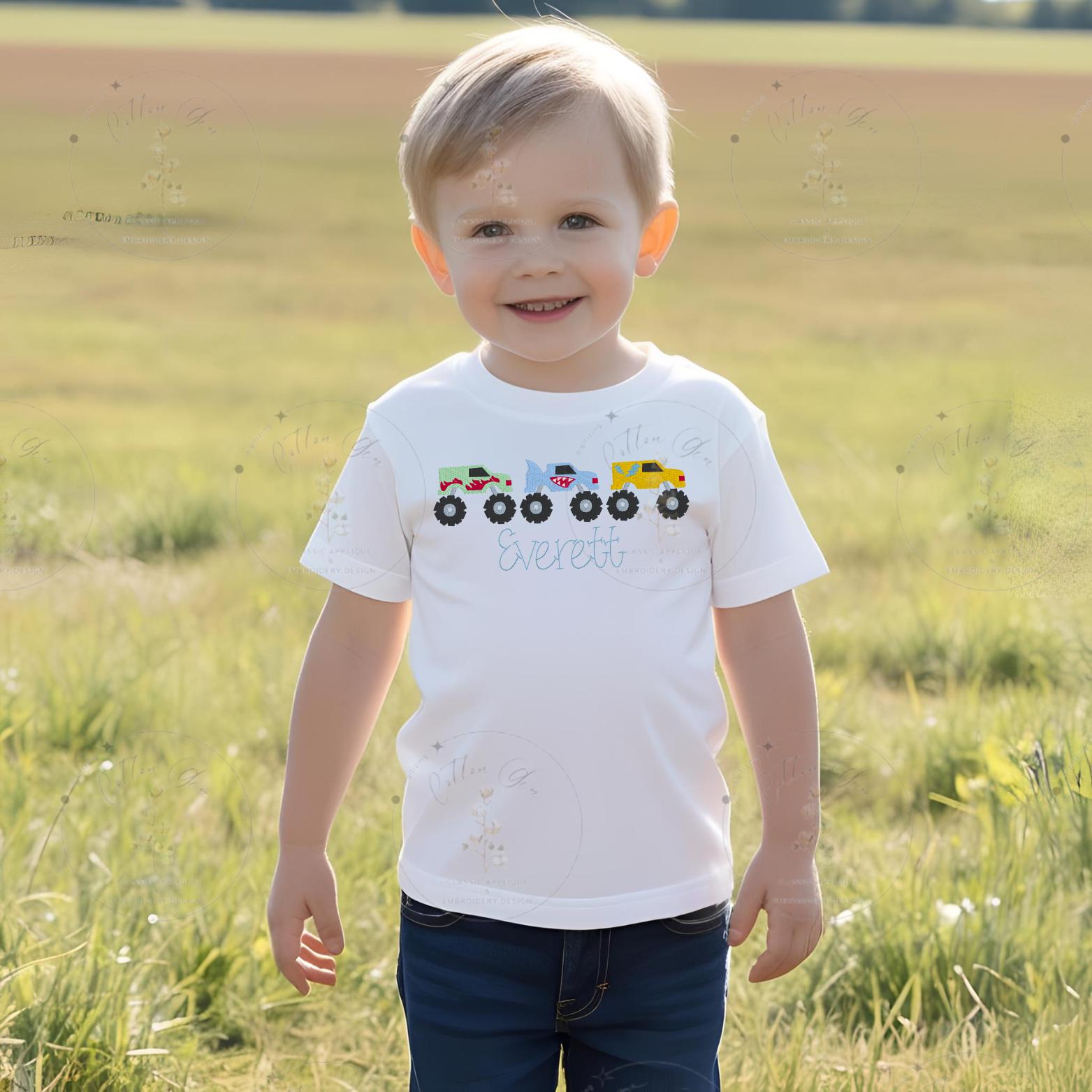 Little Boy monster truck trio dense fill, motif fill, dense stitch machine embroidery design file by cotton gin digitizing five sizes